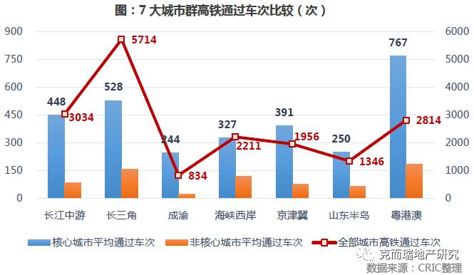 从各城市群的高铁车次数量来看,长三角城市群的高铁(此包含动车、城际高铁)车次数是最多的,高达5714次,其次是长江中游城市群,总车次为3034次,居于第三位的是粤港澳城市群,高铁通过车次最少的是成渝城市群,仅834次。由此可以看出:长三角城市群整体上高铁交通便利性最高,京津冀城市群高铁网络建设相对滞后,相信伴随着雄安新区的建设,京津冀城市群的高铁网络会快速完善。