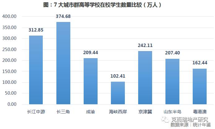 名校集聚的长三角、长江中游城市群和京津冀城市群的潜在客群量较大。高等学校在校学生是城市潜在的商品住宅消费者,因此,城市的高校学生数一定程度上影响着未来的房地产市场。从城市群的高等学校在校学生数来看,长三角城市群的高等学校在校学生数最多,高达375万;其次为长江中游城市群,高达313万;第三为京津冀城市群,约242万人。这些城市群高等学校在校人数较高,主要是因为长三角区域的上海、南京、杭州、合肥和长三角区域的武汉、长沙和京津冀地区的北京、天津等城市高校云集,这些城市囊括了全国大部分高校甚至于名校,高校的集聚提升了城市的竞争力,城市竞争力提升吸引了大量的外来人群,增量购房需求日益增加。