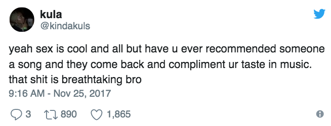 滚床单是很爽但是你有没有试过给某个人推荐你喜欢的歌,然后这人听完回来猛赞你的音乐品味?我要不能呼吸了。