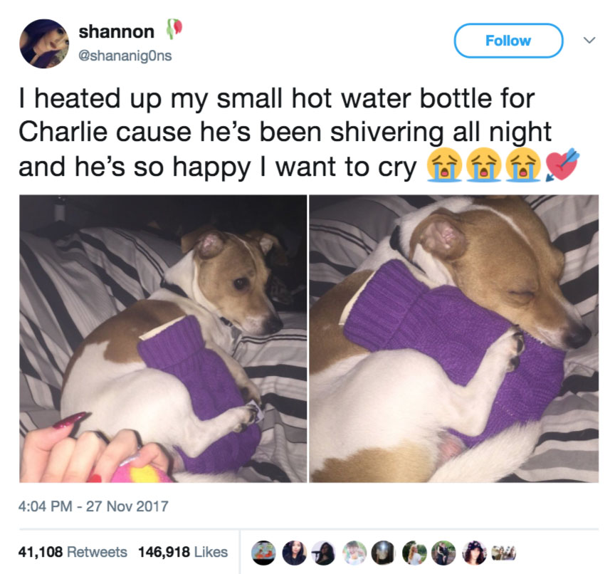 我家狗子查理晚上一直发抖,我就给他灌了一个暖水袋,他现在超开心我已经被暖哭了QAQ
