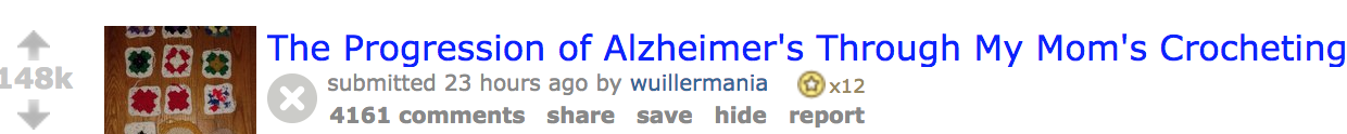 原po的母亲在最开始还能钩出花纹繁复的方垫,之后只能钩出圆形,而最终只剩下了一团乱线。