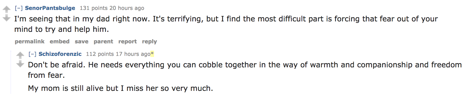 -不要害怕。他需要你能做到的一切,关怀、陪伴以及勇敢。我母亲仍然在世,但我很想念她。