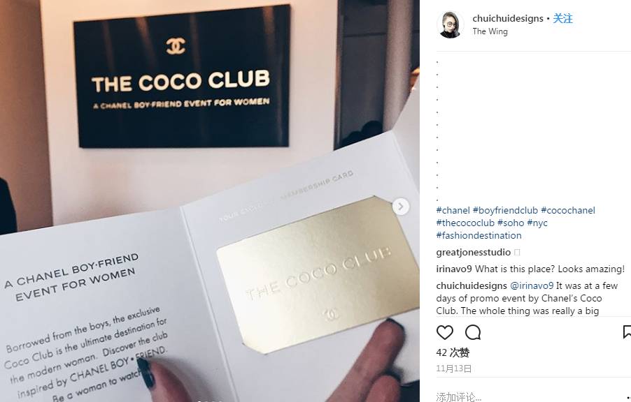 11月12日,法国经典奢侈品牌 Chanel在纽约为其颇具男士风格的新款女表系列BOY-FRIEND举办了一场别出心裁的推广活动,地点选在 SOHO区一家热门的女性联合办公空间 The Wing。当日这里成为了Chanel 主题的“一日快闪俱乐部”The Coco Club,开放时间为11月12日的上午11点~下午5点。