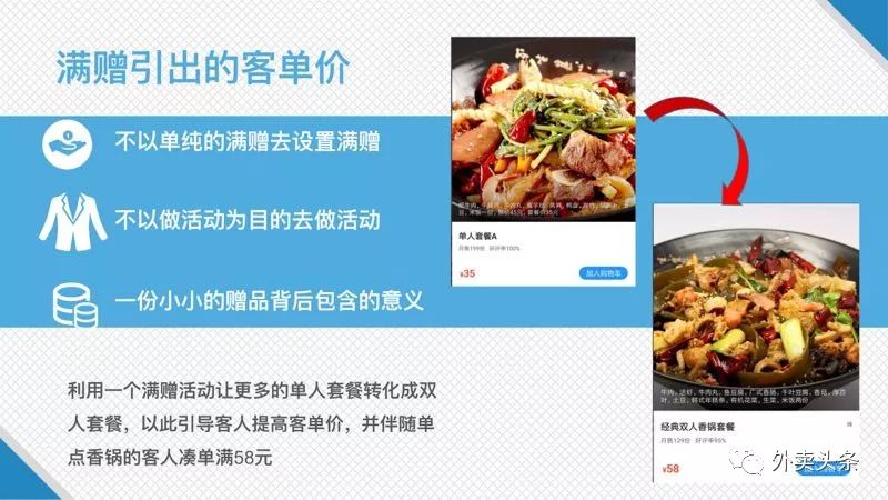 满赠活动的目的是利用用户“爱占便宜”的心理,通过赠送礼品的方式让用户下单,让外卖商家提高客单价。