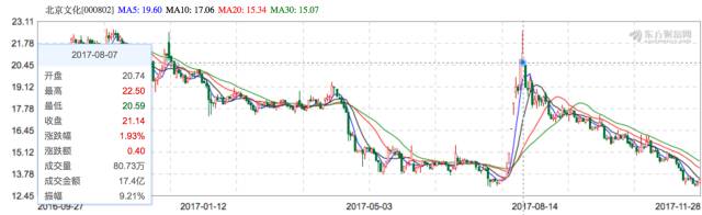 在《战狼2》上映前,北京文化的股价也曾一直呈下降趋势,在《战狼2》上映的当天,北京文化的市值也不足100亿。不过,从《战狼2》上映的7月27日开始算起,直到其打破《美人鱼》纪录的8月7日,短短8个交易日,北京文化的股价已经从13.54元/股上涨至21.14元/股,累计涨幅达56%,市值增长55亿左右。