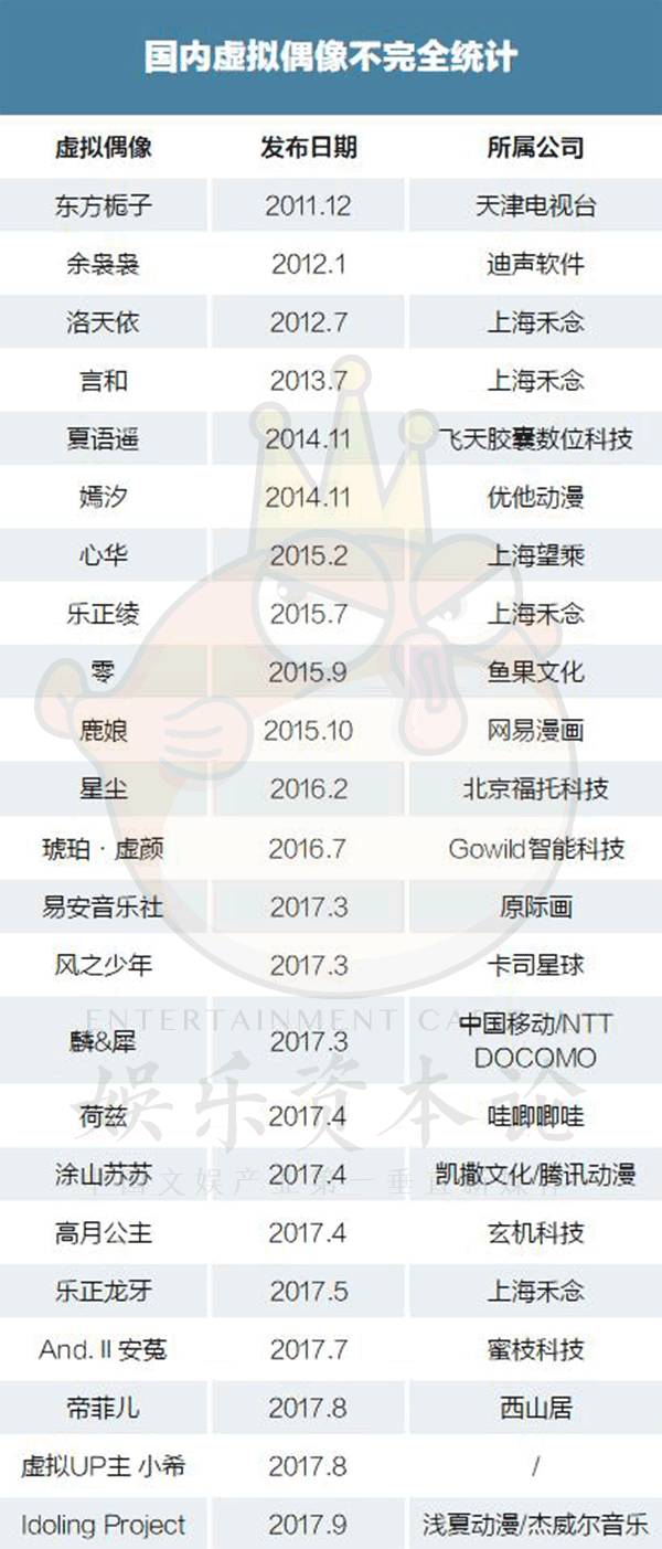 除上述背景的公司外,一些和二次元关系不太密切公司也在进入,如本来生产电子产品的北京福托科技,2016年2月推出了虚拟歌姬星尘;中国移动则与日本通信公司NTT DOCOMO合作,于2017年3月推出了“麟&犀AI计划。”