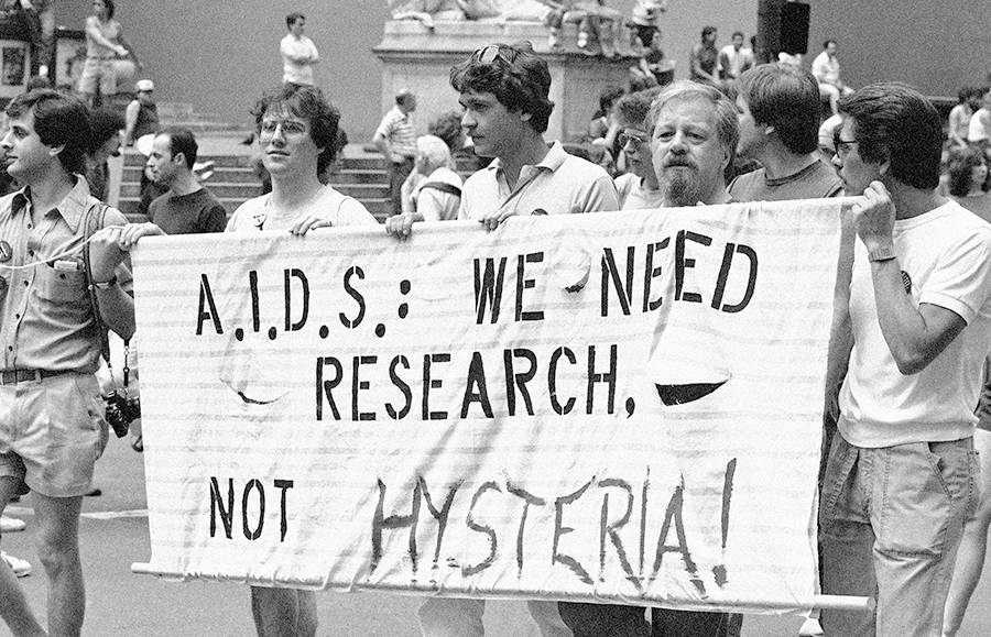 ▲ 1983年,纽约街头的“骄傲游行”中,游行者呼吁为艾滋病研究提供更多的资金支持。 Mario Suriani / Associated Press