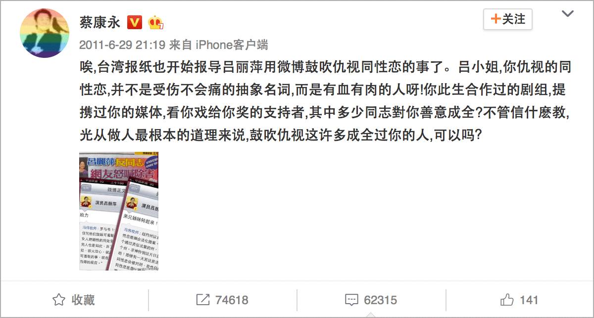 ▲ 2011年,吕丽萍反同言论在微博发酵,蔡康永对此事的回应转发量达到数万次。