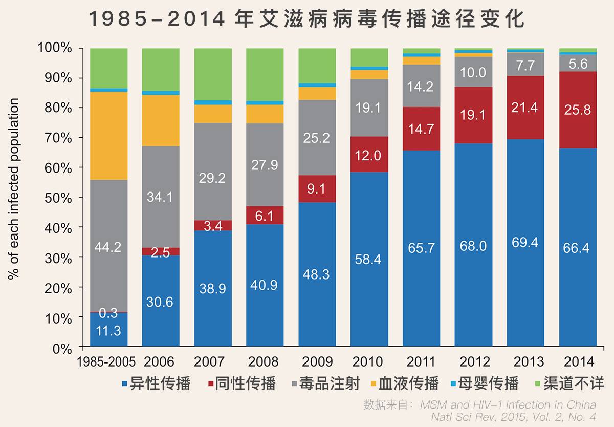 而不凑巧的是,此时艾滋病病毒通过男男性行为传播的所占比例在持续上升。据中国卫生部和联合国艾滋病规划署(UNAIDS)的数据显示,2005年之前,我国新发感染者病例一直以注射毒品和血液传播途径为主,随后,注射毒品和血液传播途径导致的传播得到显著控制,但性传播病例却快速上升。