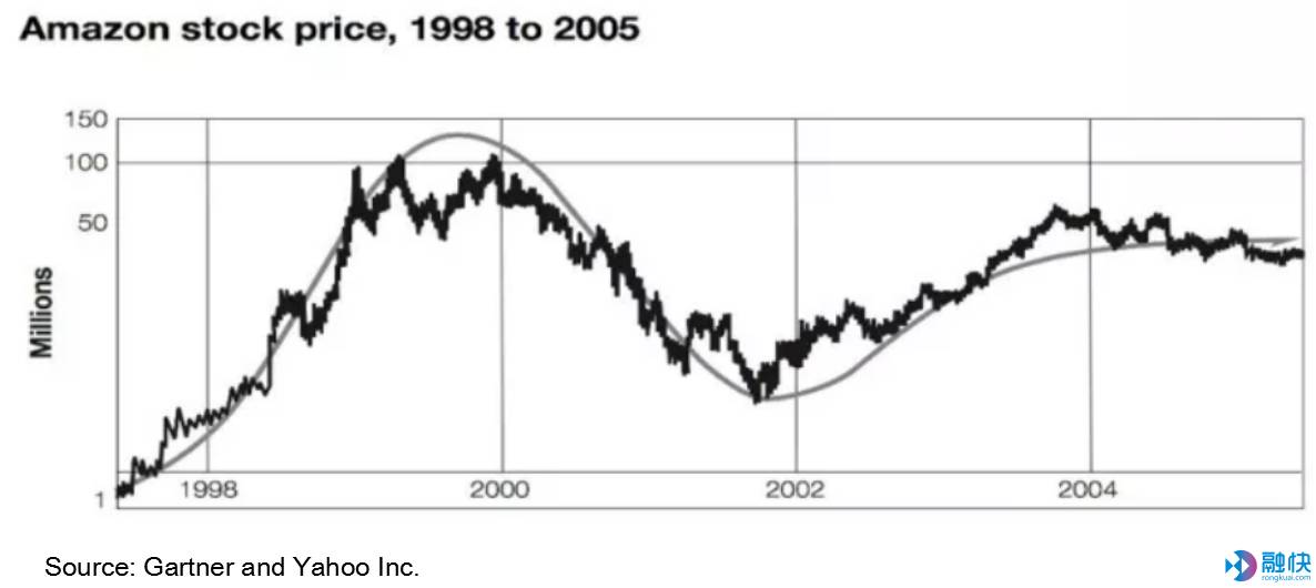 在许多技术发展的历史进程中都会看到Gartner曲线的影子,比如Web技术,Amazon和Yahoo在1998年-2005年间的股价变动就和Gartner曲线的走势非常类似。