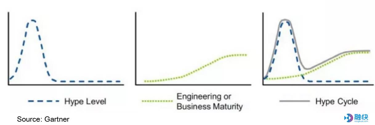 要用Gartner曲线去理解人工智能的发展,我们还需要理解Gartner曲线背后的逻辑。Gartner曲线实际上是由两条曲线叠加而成的,第一条是社会舆论对新技术期望值与实际水平的差距(Hype Level),第二条则对应新技术的真实发展水平(Engineering or Business Maturity),二者叠加所对应的正是y轴,代表社会上对新技术的实际期望。Hype Level先升后降的逻辑在于新技术出来之后。由于媒体本身的属性,必然会导致新技术社会期望的过度拔高,而随着技术的落地与试错,社会对新技术的期望会逐渐回归理性。因而Hype Level曲线会呈现先升后降再回归正常水平的线形。而Engineering or Business Maturity曲线的逐步提升与技术随时间逐渐提升的常识也是相吻合的。