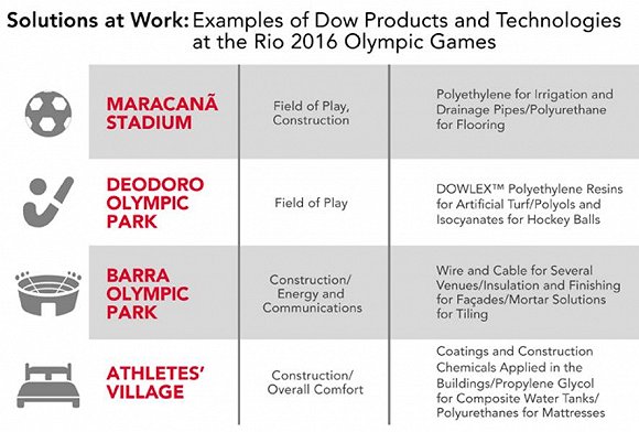 在里约奥运会上,陶氏化学与奥运会签订了两份合作协议,分别成为国际奥委会的官方化学公司和2016年里约奥运会的官方碳合作伙伴,帮助主办方缓解碳排放问题。