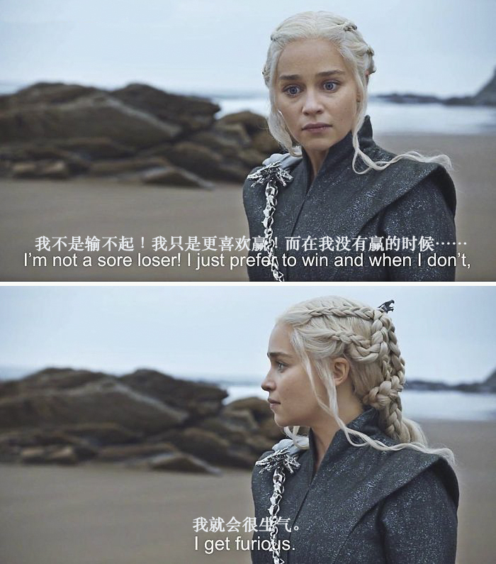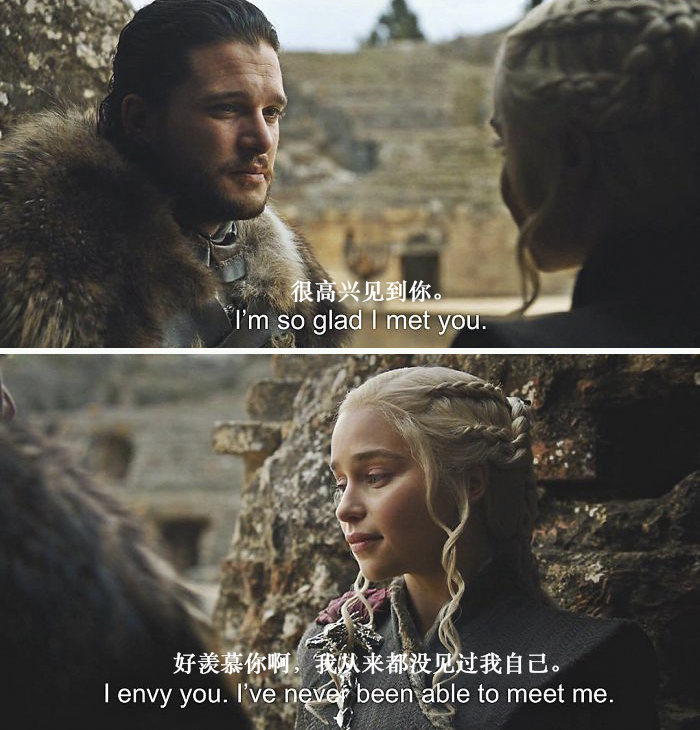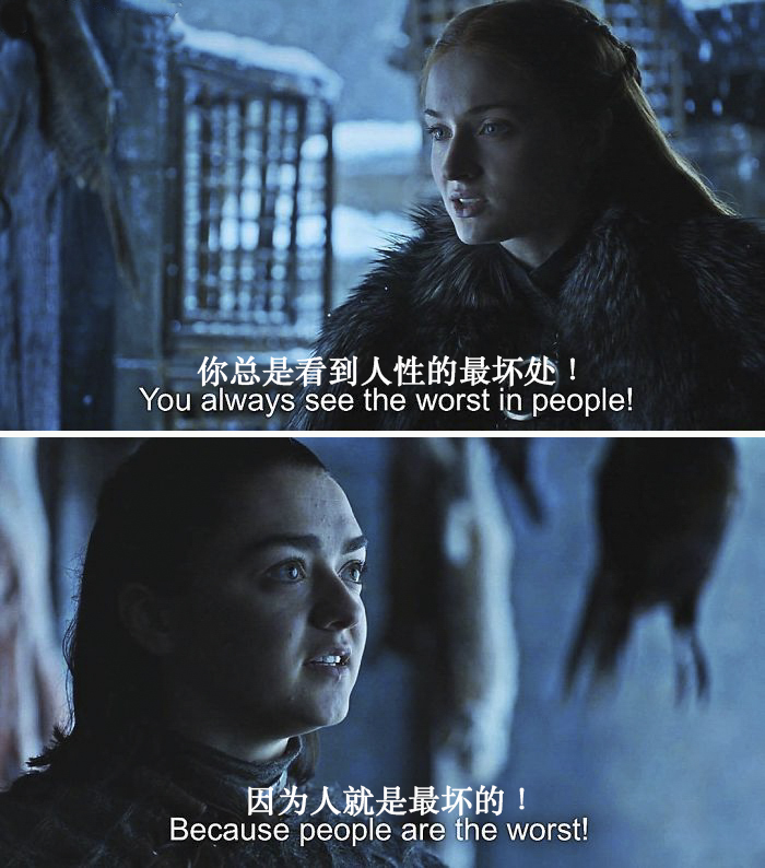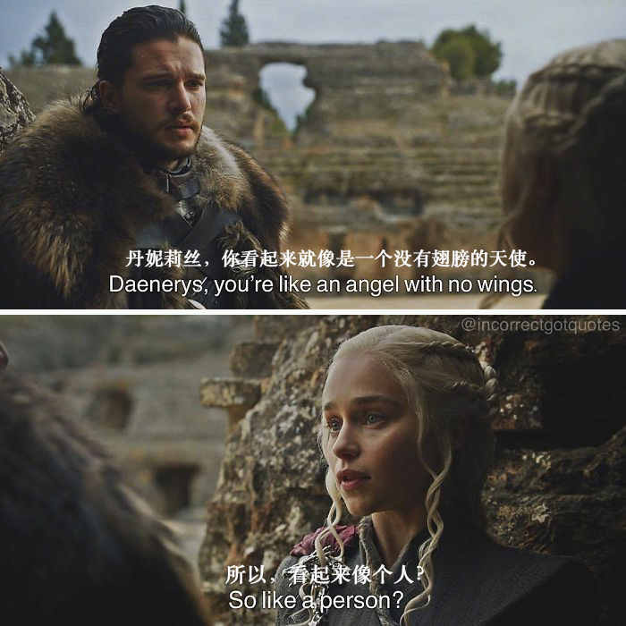 好的,现在我们已经准备就绪,是时候用《权力的游戏》来庆祝一下将至的凛冬了。第七季最后一集播出之后,我就转向去找一些同人小说来填补没有《权力的游戏》的空白时光。结果发现,有一个Instagram的账号专门发一些转疯了的推特、汤不热(Tumblr)的帖子,还有随意的情景对话,配上《权力的游戏》截图,结果往往比原来的场景更加好笑了。