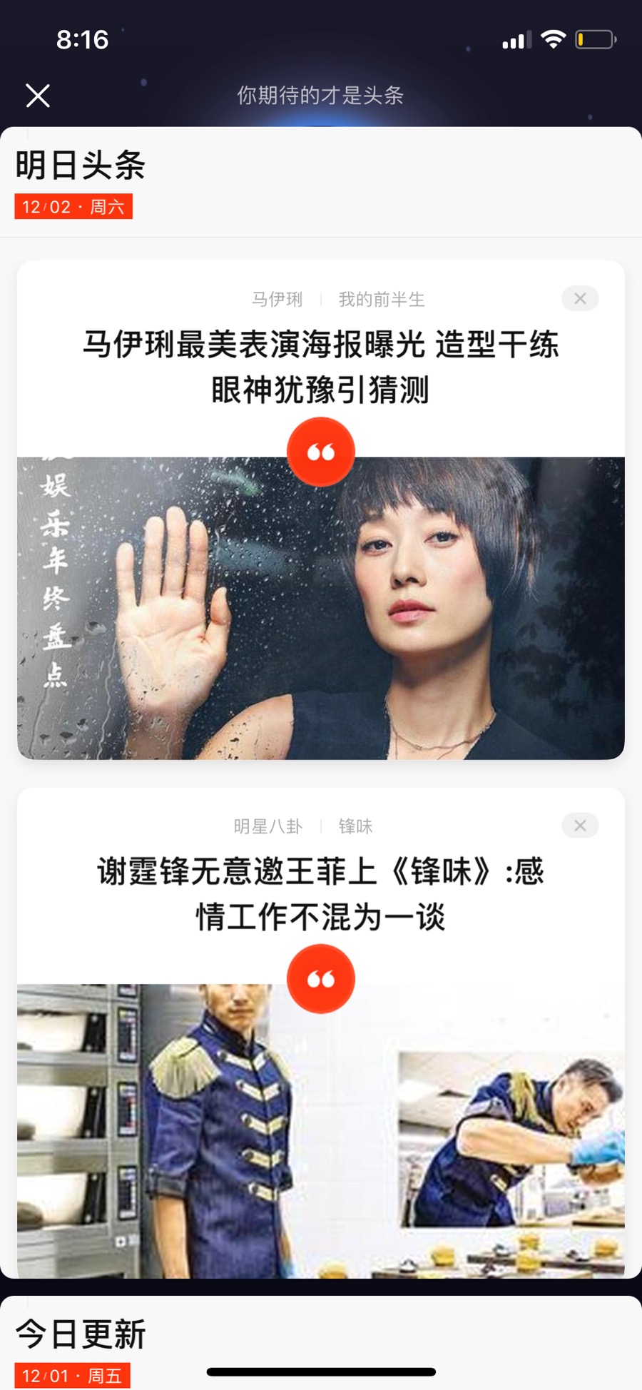 那既然明日头条是提前发布未来将会发生的事情,这就很容易让人得出结论:明日头条不过就是一个每篇不超过1000字的新闻“预告”的集合平台。但是实际上,当你点进明日头条的卡片,最下方会浮现出“今日更新”的入口,你曾经在明日头条中阅读的新闻的最新动态都可以在这里查看,即使没有相关信息更新,其也会显示在“今日更新”的信息流中。例如,11月29日,你查看了“明日头条”中的一则新闻“哈里王子婚礼将于明年5月举行”,11月30日,其就会出现在“今日更新”中,即使并没有婚礼信息,但是与此内容相关的最新消息均会在此呈现。因此,与其说“明日头条”是新闻的预测和预告,倒不如说是今日更新与明日头条协同产生持续性的跟进新闻阅读服务。