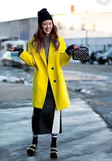 在草地云雀黄的外套里面穿上黑灰的内搭,吸睛出彩。