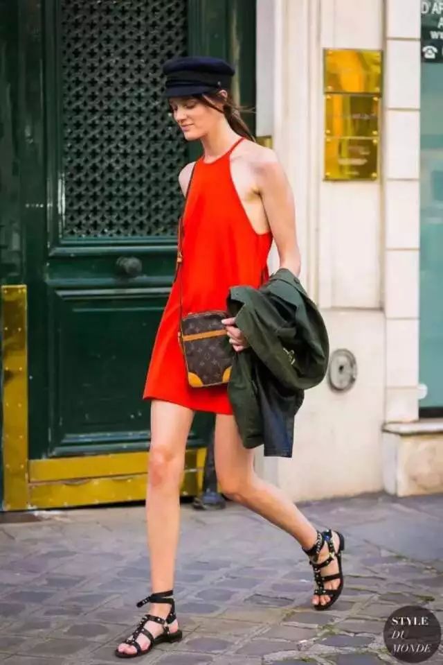喜欢玩拼接撞色的时尚达人,深谙“二八”法则,小面积的红色点缀在大面积的黑色上。左脚白色短靴和包包呼应。毕竟,不论是白+红,还是黑+红,都是十分经典的配色方式。