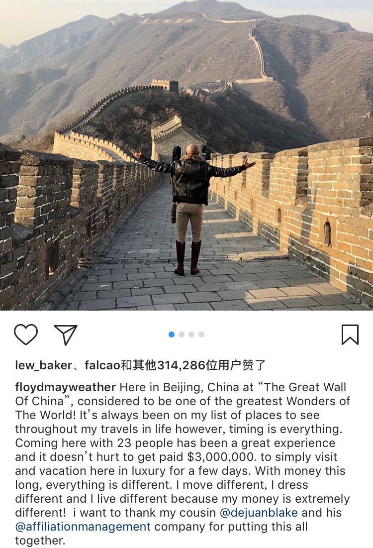 世界拳王梅威瑟开启首次中国行后,便直接在社交媒体上发布了上述内容,透露了他此次中国行的出场费,约合人民币1984万元。