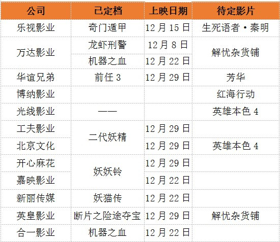接下来,进入了12月下旬,几乎贺岁档的热门大片全部集结在了这个时候。其中乐视影业的《奇门遁甲》和华谊的《芳华》同一天上映,有望对垒。