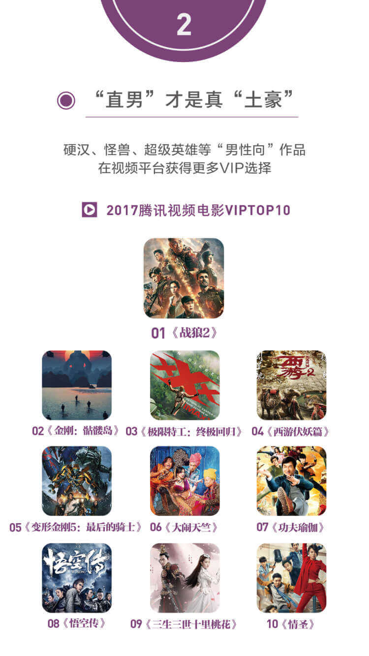 电影方面,指数报告呈现的趋势是高票房引来高流量。在院线斩获56亿票房的《战狼2》在腾讯视频获得4亿点击,成为2017年院线电影播放量冠军,《西游伏妖篇》、《熊出没·奇幻空间》、《情圣》等热门电影也都表现不错。网络大电影方面,探险、魔幻、武侠题材在2017年集中爆发,《魔游记》系列,《摸金笑尉》、《九天玄鸟》、《最后的武林》等作品均出现在2017腾讯视频网大电影票房榜。腾讯的数据显示,三线城市的男性用户是网大的核心受众群,95后已成消费主力。