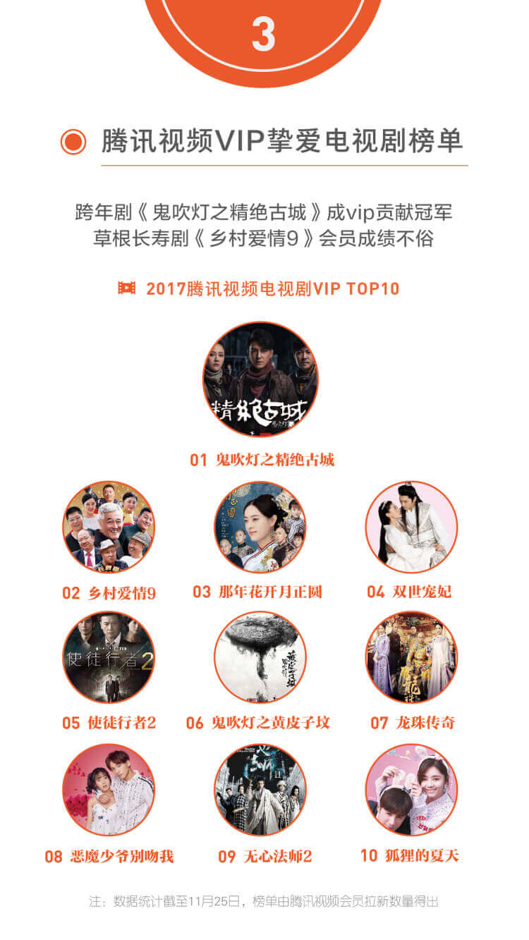 指数报告还显示,2017年腾讯视频上线的230余部新剧里,《那年花开月正圆》以126.83亿播放量位列年度卫视剧榜首,《楚乔传》、《三生三世十里桃花》则以124.37亿和104.02亿位列二三,成为今年流量大赢家。网剧方面,腾讯视频自制剧《鬼吹灯之精绝古城》凭借45.18亿点击成为2017度网剧第一名。付费用户数据显示,《鬼吹灯之精绝古城》、《乡村爱情9》、《那年花开月正圆》、《双世宠妃》对腾讯视频的拉新有较强作用。