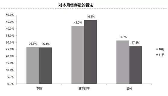 区域指数显示,11月份全国总指数为49.8%,北区指数为48.7%,西区指数为50.8%,南区指数为44.1%,东区指数为51.3%。11月份,北部地区农忙结束,市场需求开始回升;广州车展对南部地区的市场需求也起到了提振作用。认为11月份集客量下降的经销商比例为26.4%;认为增长的比例为27.4%,认为集客量基本持平的比例为46.2%,实际集客量与上月基本持平。