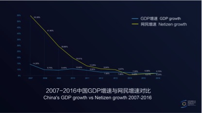 所以,请大家先看一张图。这张图是过去十年,中国互联网网民的成长速度和中国GDP成长速度的比较图。我们看到,十年前中国互联网网民成长在50%以上,到今天其实到了6%左右。事实上,过去的四年,中国互联网网民的成长速度都已经慢于中国GDP的成长速度了。这意味着什么呢?意味着互联网的人口红利没有了。所以去年我在这里说“无线(移动)互联网已经结束了”,大多数人都不同意,很多人讲,没有结束、只是进入了下半场。今年我看到,原来讲“下半场”的人都开始讲人工智能了,所以我的下一页PPT也给大家讲一讲人工智能。