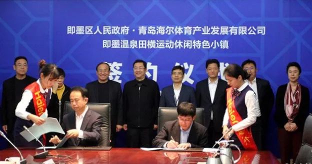 11月30日,即墨区与青岛海尔体育产业发展有限公司签订《即墨温泉田横运动休闲特色小镇框架合作协议》。根据协议,海尔集团将投资300亿元,将即墨温泉田横运动休闲特色小镇打造成涵盖体育赛事、全民健身、教育培训、演艺、养老大健康、全域旅游等多个业务板块的世界级体育运动休闲项目。