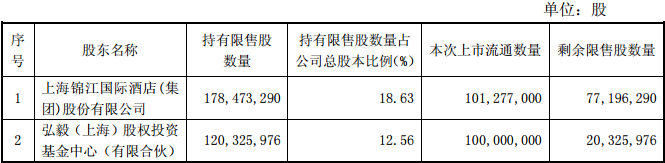 本周解禁市值排名第二的公司为酒店公司锦江股份。本次上市的股份为三年前的非公开发行限售股。公司12月6日有2亿股限售股上市流通,占总股本比例为21%。