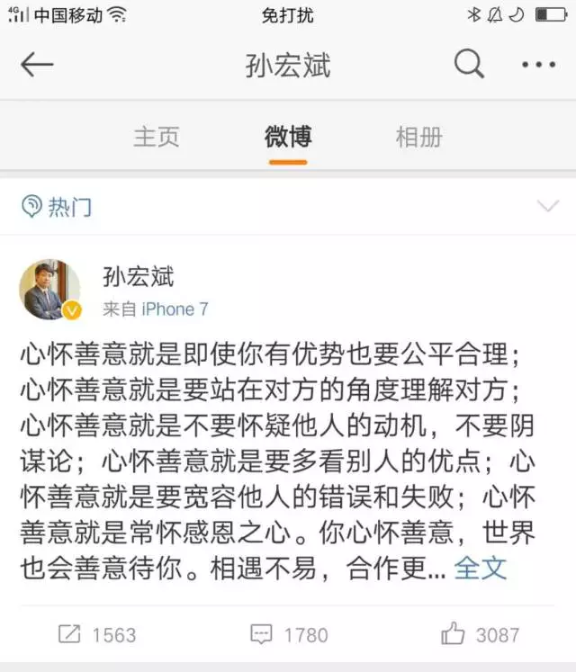 近两年,较少更新微博的孙宏斌,在9月4日曾写下这样的一段文字: