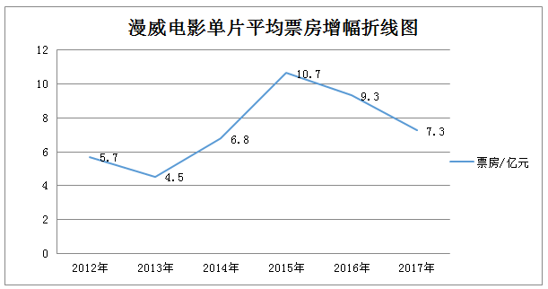 通过对比近年来内地年票房的增长折线和同年漫威电影单片平均票房的变化折线不难发现,2016年以前,两项数据的变化趋势基本相同,随着内地电影市场越加繁荣,漫威在中国也越发受到欢迎。2015年,漫威单片平均票房和全国总票房的增长速度同时达到顶峰,同比增幅分别为惊人的49%和56%。然而2015年之后,漫威的平均票房并没有随着内地总票房一起趋于稳定,反而出现下滑的趋势,到今年更是跌落到7.27亿,几乎回到2014年的水平。