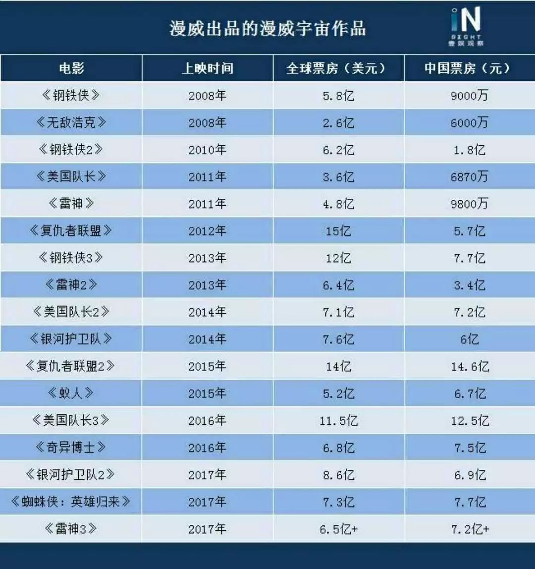 以中国市场为例,2016年以前漫威作品一直是电影市场最具吸金能力的电影,其在中国地区的票房基本能占全球总票房的15%以上,在每年有数百部影片上映的情况下,2012年的《复仇者联盟》、2013年的《钢铁侠3》以及2015年的《复仇者联盟2》单片票房均占到国内全年总票房的3%以上,尤其是《钢铁侠3》的3.6%,至今仍没有一部超级英雄电影可以打破这一纪录。