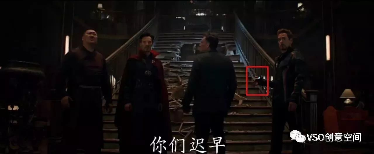 托尼、奇异博士、班纳和王站在至圣所这幕,可以看到托尼手上拿了一部手机,正是《美队3》最后,队长寄给托尼的那部。手机屏幕在这里是亮着的,多半是队长因为地球危机来临,主动联系了托尼。