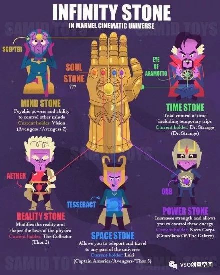 相信熟悉漫威系列的粉丝,对这个灭霸这个超级大反派都不会太陌生。这个多次在漫威电影彩蛋里溜达的神秘坏蛋终于正式出场了,作为史上最恐怖反派,灭霸这次将携他的黑曜五将来地球夺取六颗无限宝石——每一颗宝石都能在某方面赋予使用者全能的控制权力,拥有这六颗宝石就能拥有操纵时间、空间、现实、心灵、力量、和灵魂的能力,几乎无所不能。