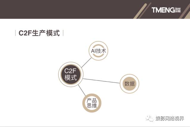 数据方面,阴超介绍了淘梦独家打造的C2F生产模式。“我们更多是在做数字背后的深度分析,意在透过数据分析、预估项目的可行度。”简而言之,就是数据—项目—内容—用户—市场之间的信息流闭环。根据他的解释,C2F是通过爬虫技术获取微博微信舆情、视频平台、百度指数、搜索引擎等相关数据,并对市场上的上千部电影进行标签化。具体到每部作品的关键词、内容、热度、演员指数、用户画像、受众反馈等内容,由此找到用户的需求是什么、希望看到什么样的产品。然后再回到制片体系,为适合的导演与团队提供一套极具参考性的结论,让他们去生产和提供相对应的产品和内容。此外,阴超主张用产品思维去运营网络电影,这也是淘梦在行业里最突出的竞争力。