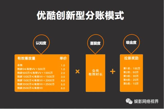 优酷创新型的分账模式,以“播放量、播放时长、会员拉新”为维度,开放分账维度、回归作品的内容价值。在优酷看来,播放量=观众认知度、播放时长=观众喜爱度、会员拉新=吸金度。在此模式下,重新定义网络电影的分账。并且优酷也在11月15日首次发布网络电影分账榜单,希望通过该模式的不断探索,和同行们一起找到网络电影领域中更好的分账合作方式、实现利益最大化。