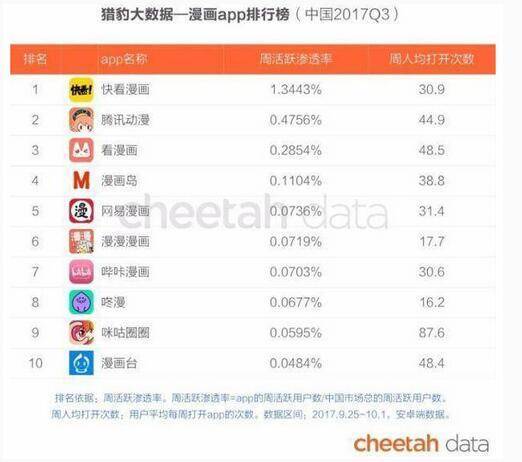 4、快看的平台和用户领先优势突出。Questmobile的2017年的6月数字阅读APP用户规模数据显示,快看漫画以3146万的月活排名第三,仅次于掌阅和QQ阅读,不同的是快看用户中95后居多。而在漫画领域快看漫画一骑绝尘,远远领先于行业第二名的腾讯动漫,猎豹大数据2017年Q3的数据显示快看漫画周渗透率为1.34%,大于行业第2名至第10名的总和,排在第二名的腾讯动漫周活跃渗透率仅为0.47%。