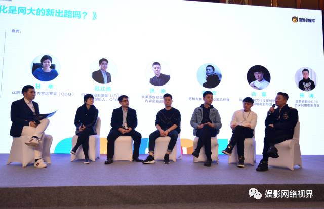 (左起:令狐采石/搜狐视频付费会员业务内容合作总监、甘辛/优朋普乐首席内容运营官(COO)、范江浩/互联网电影集团(IFG)联合创始人、CEO、张余/映美传媒联合创始人、内容创意副总裁、李思文/奇树有鱼影视事业部总经理、吕磊/新合艺影视文化传媒创始人、资深网络电影导演、张涛/造梦师影业CEO、资深网络电影导演)