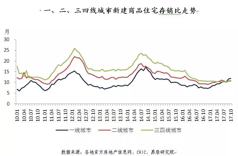 近期,易居研究院公布了全国80城库存报告。2017年10月份,一、二、三四线80个城市新建商品住宅存销比分别为11.9、10.7和10.9个月。相比9月份11.6、10.6和10.8个月的数值,三类城市均有所反弹。