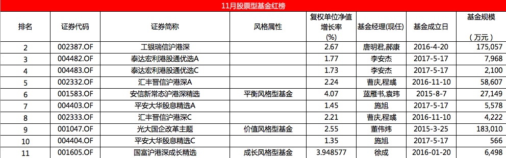 根据Wind资讯数据统计,11月全市场存续主动管理股票型基金共有263只,11月平均收益率为-2.96%,上月为3.27%。下表为综合得分较高的10只基金: