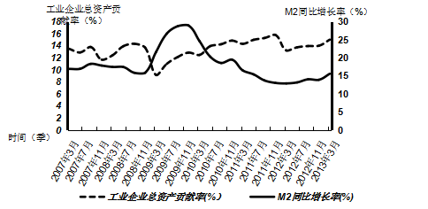 从国家统计局公布的M2同比增长率(季)和工业企业总资产贡献率(季)的波动对比情况来看(图1),M2和工业企业总资产贡献率之间存在同向变动的趋势,通常如果货币供应量M2增加,则企业的贷款和投资增加,从而企业总资产增加,促使产量和销售增加,最终企业利润增加,但是这种关系却略显滞后甚至不明显。