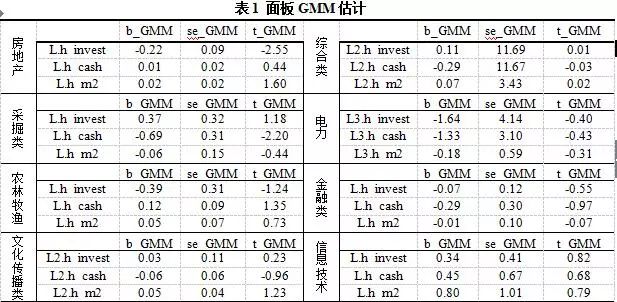 同时,根据表1中面板GMM的估计结果,13个行业的各解释变量回归系数的显著性存在明显差异,回归系数也存在正、负差异,说明各个行业对货币政策的敏感度不同,而且货币政策对各行业货币资金和投资的影响也存在着方向上的不一致性。