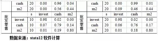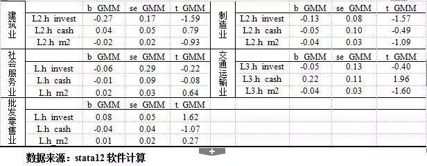 通过观察不同的滞后阶数可知:对于货币政策调控力度较强的行业,当期投资净额主要受前期投资净额的影响,而与货币资金无关,因为即使在货币紧缩时期,这些行业的企业也能够从银行取得贷款,较少面临资金短缺的风险。