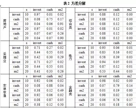 1. 货币政策变量M2共对9个行业(房地产、采掘业、农林牧渔、文化传播、电力煤气和水生产业、信息技术、建筑类、制造业、交通运输仓储业)的企业投资变量在第10个和第20个预测期具有较强的解释作用,占到样本总数的89.5%。