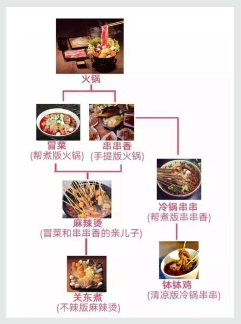 很多人对于火锅、串串、冒菜、麻辣烫、冷锅串串、钵钵鸡、关东煮等品类,傻傻分不清楚。但实际上,它们之间的族群关系,应该是这样的——