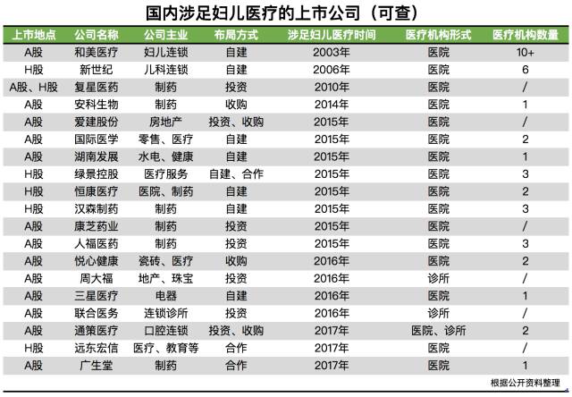 据健康点不完全统计,目前有19家上市公司纷纷布局妇幼医院领域。其中既有产业资本,也有爱建股份、绿景控股这样从房地产行业转型而来的公司。