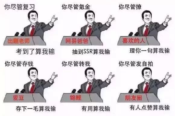 又一个“XXX,XXX”句式流行语。最早的版本是“你们尽管复习,考到了算我输”,来源于微博,然后被油菜花的网友制作成一张表情包,随后受到了网友们大量的转载和使用。