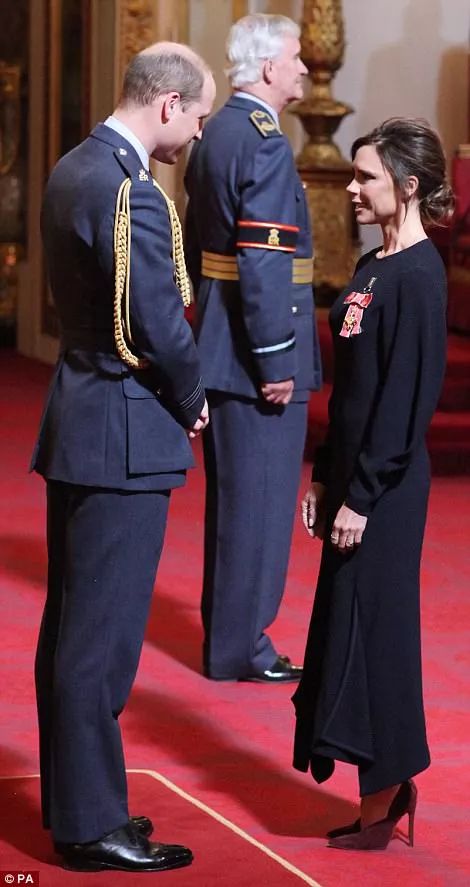 今年四月,维多利亚贝克汉姆参加了白金汉宫的授奖仪式,威廉王子给她戴上了OBE勋章,老公贝克汉姆作陪,夫妻俩恩爱满满!