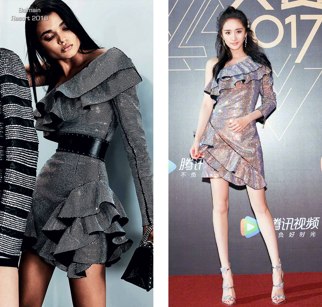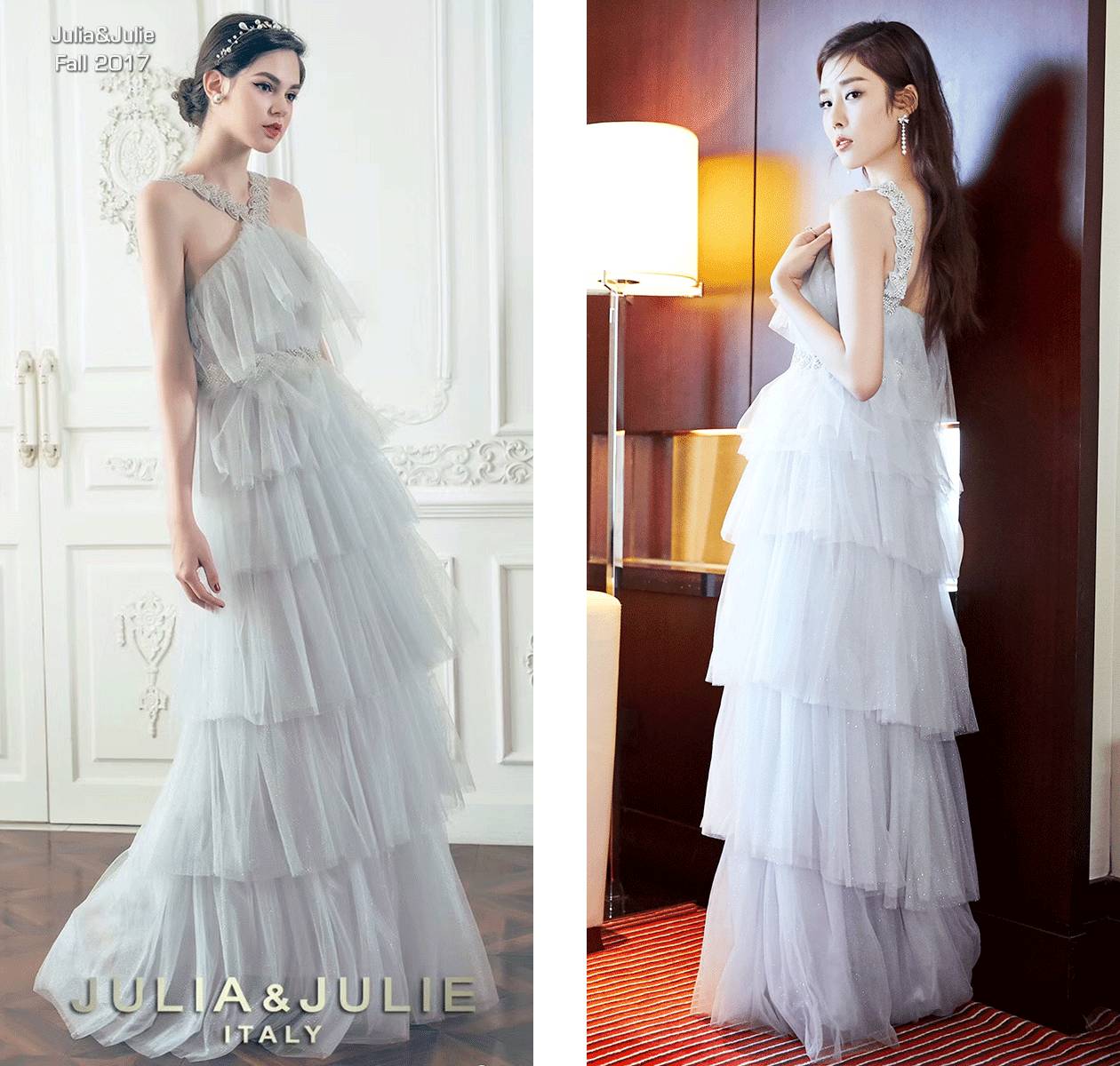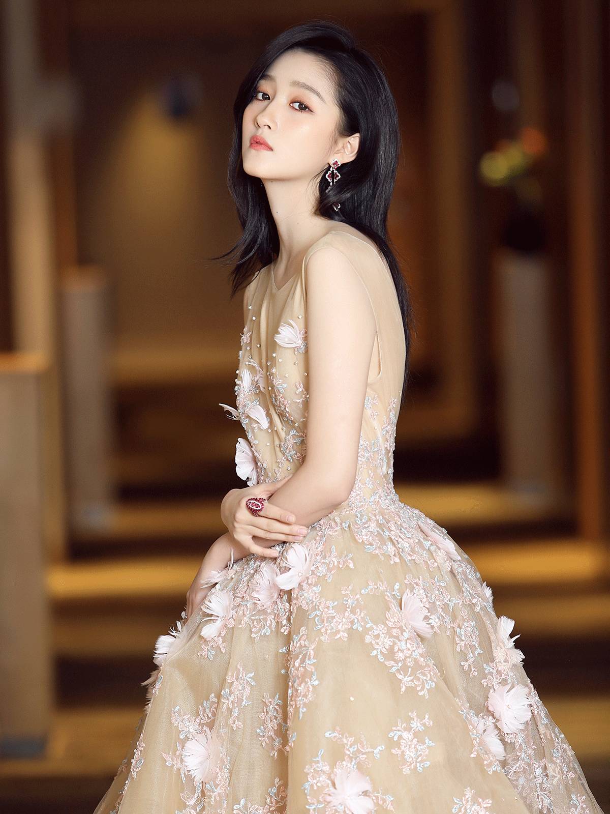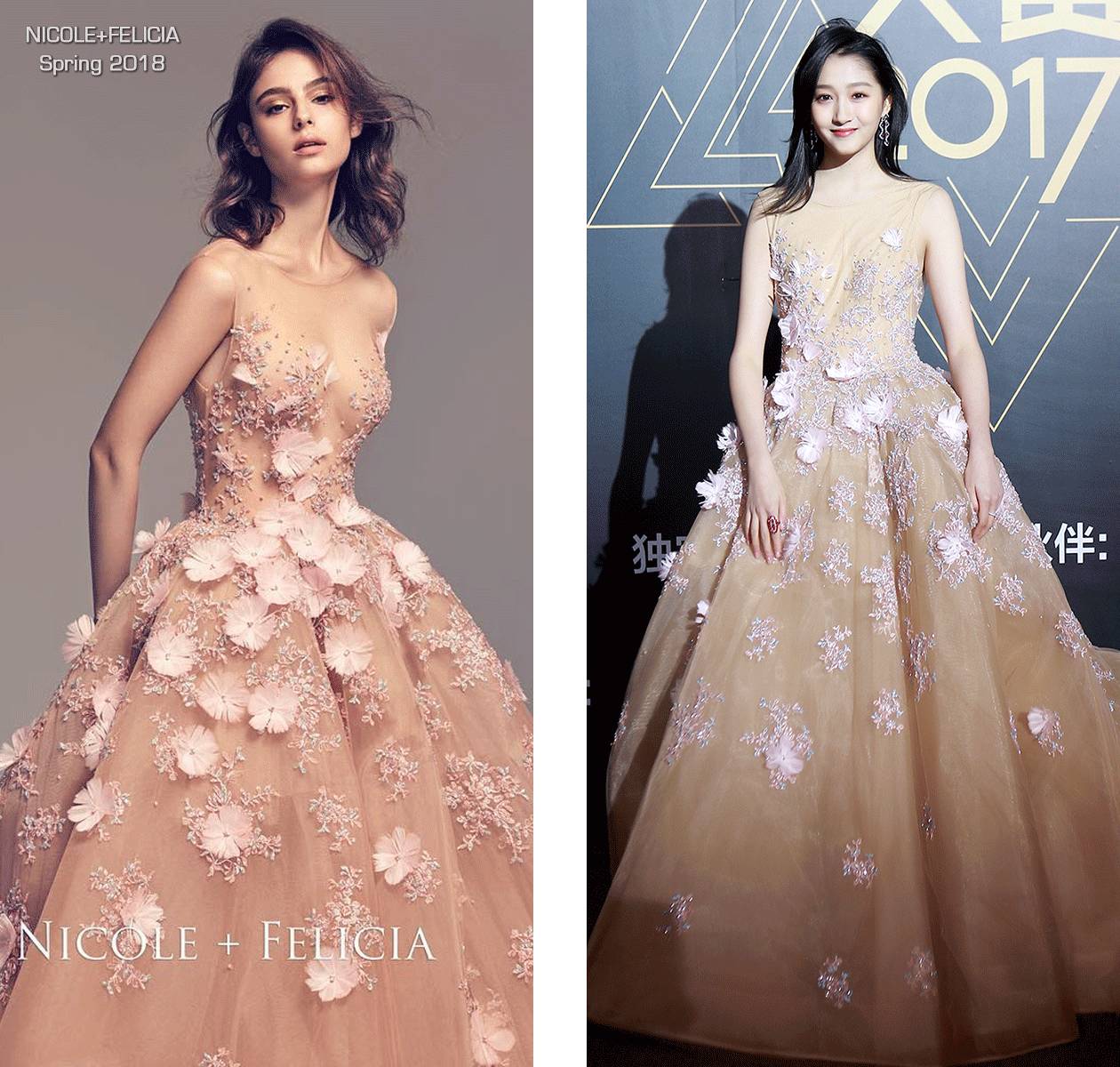 这件裙子本来唯美的一塌糊涂,裸色的纱裙性感的透视,就像仙气卷着花瓣缠绕在少女的身体上,但这一切都被关晓彤地摊上十块钱一打的肉色背心毁了,理想与现实的差别有多大,看她就知道了。