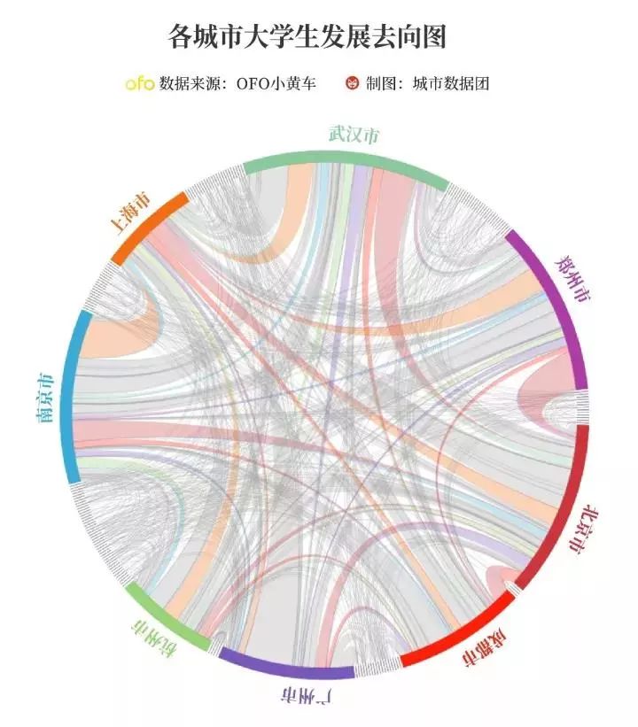 在这张图上,城市间的连线代表大学生流动的方向。每两个城市之间都有两条连线,线条的粗细表示这两个城市间流动的大学生数量占流出城市的外流大学生总数的比例,线条的颜色则代表流入的城市。