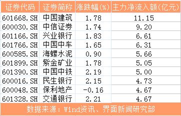 今日占据主力净流入个股前十中的个股悉数为行业龙头股。中国建筑(601668.SH)以11.15亿元的主力净流入额占据个股榜首,中国中车(601766.SH)、中国中铁(601390.SH)分别实现主力净流入6.31亿元、5.00亿元。权重金融股表现最为亮眼,中信证券(600030.SH)、兴业银行(601166.SH)、民生银行(600016.SH)、交通银行(601328.SH)分别吸引主力资金净流入9.20亿元、6.61亿元、4.73亿元、4.67亿元。此外,保利地产(600048.SH)临近收盘时股价出现跳水,依旧实现主力净流入4.67亿元,跻身个股前十。
